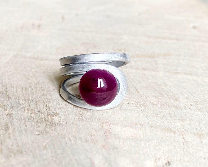 Anello in alluminio con semisfera piccola in vetro di murano lavorato a lume color viola ametista scuro.