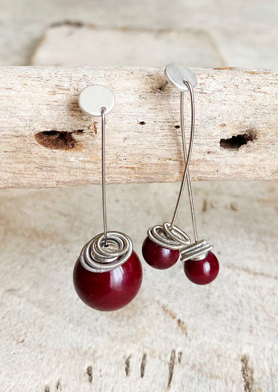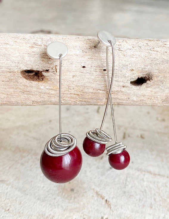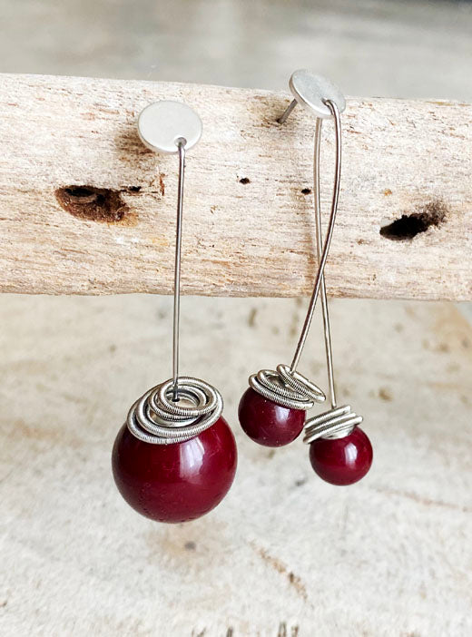 orecchini pendenti lunghi fini 2 perle rosso scuro / 1 perla grande - asimmetrici