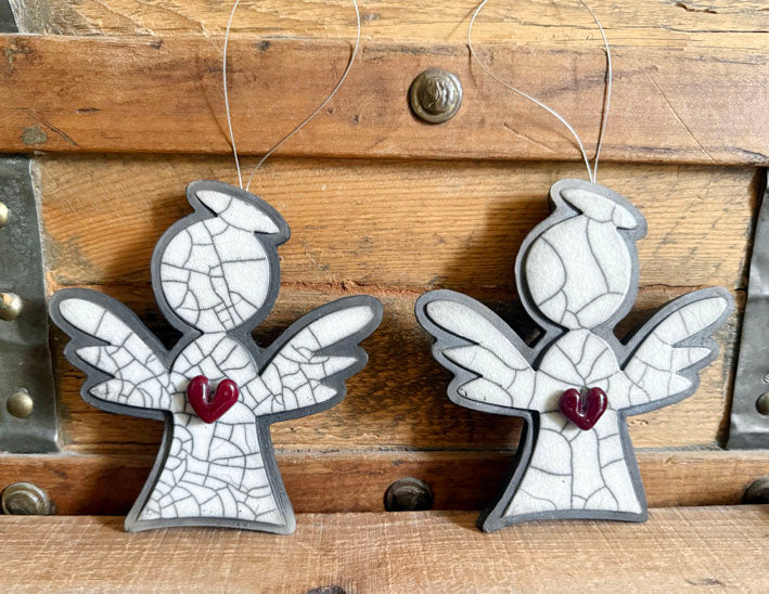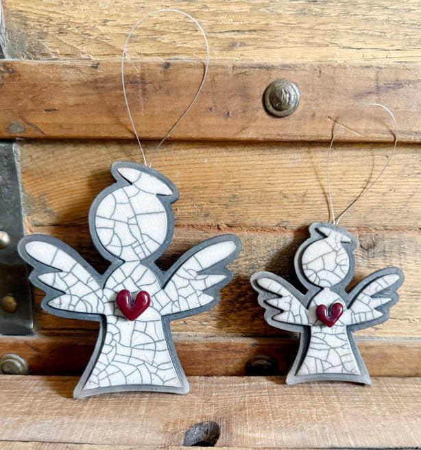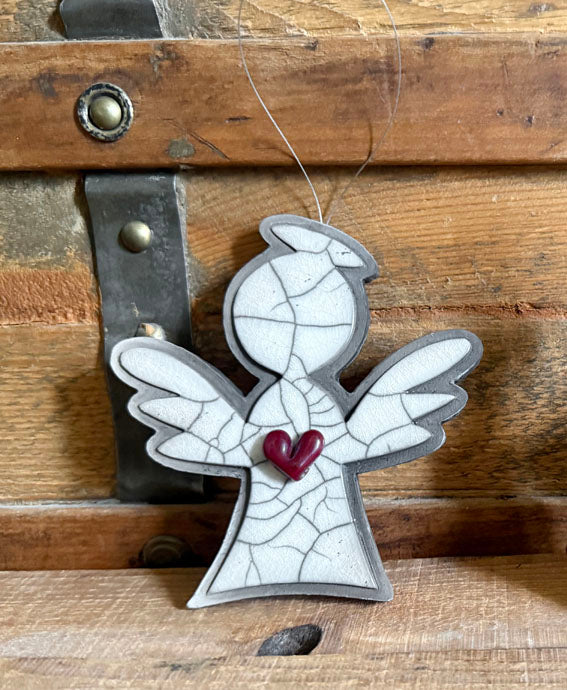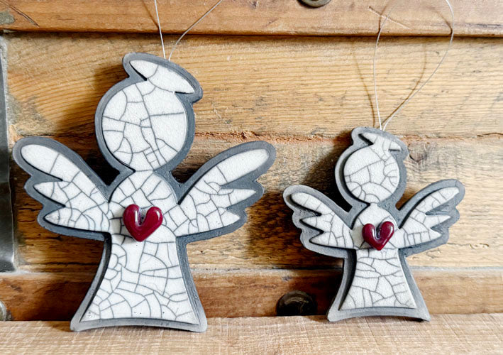 Decorazione per albero di Natale: angeli in ceramica raku con cuore in vetro di murano lavorato a lume color rosso scuro.