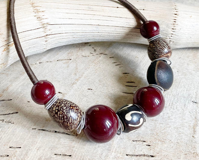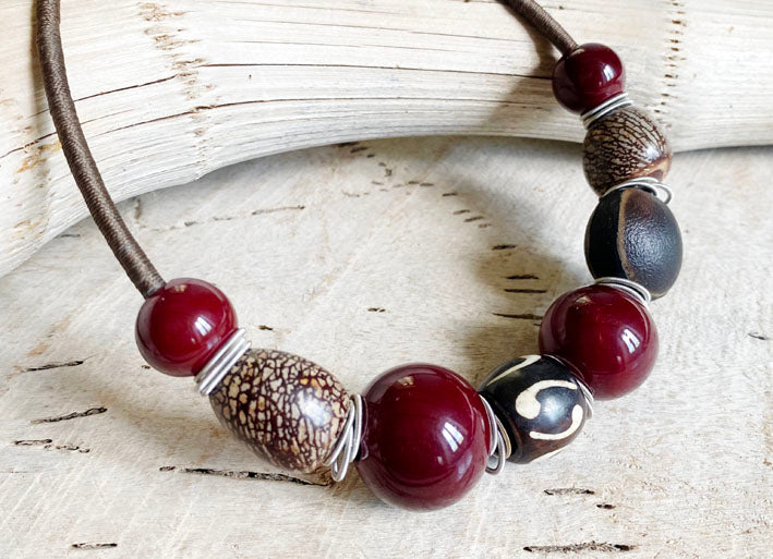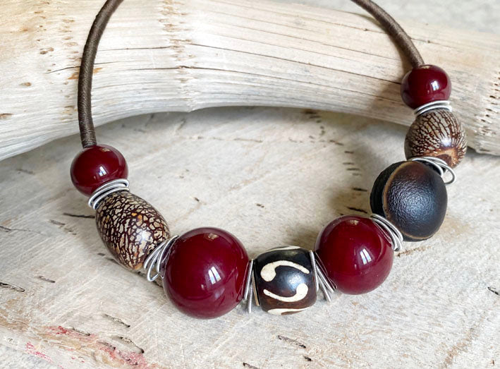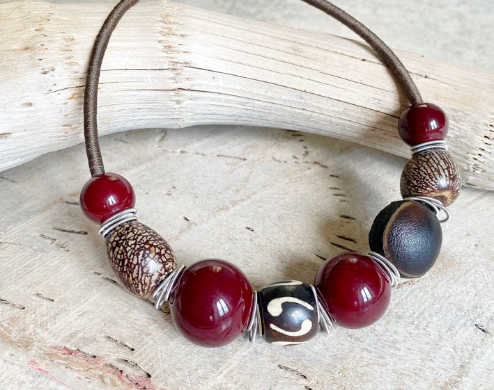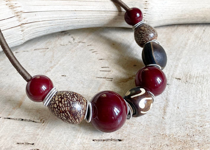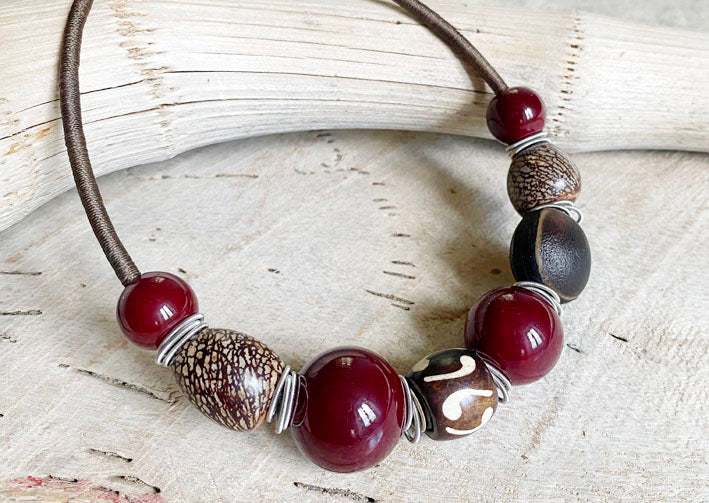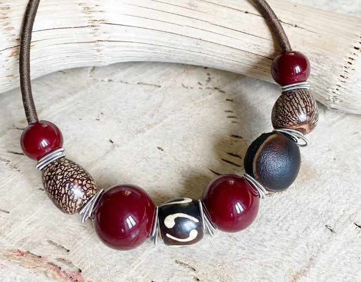 collana in vetro di murano soffiato e lavorato a lume color rosso scuro + semi. Girocollo in corda cerata marrone scuro.