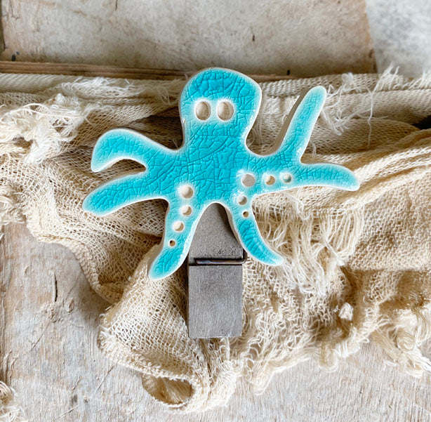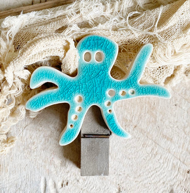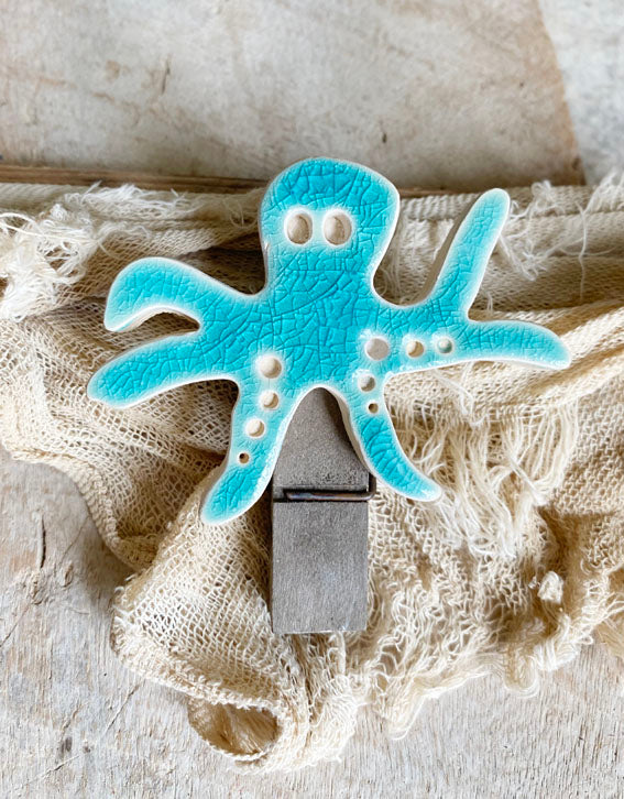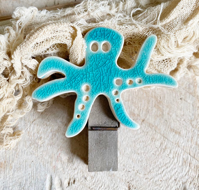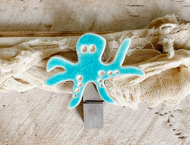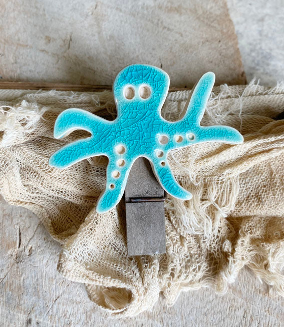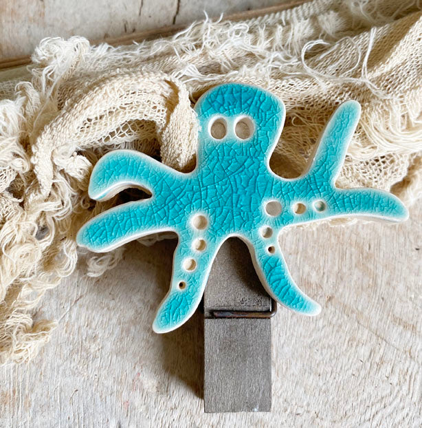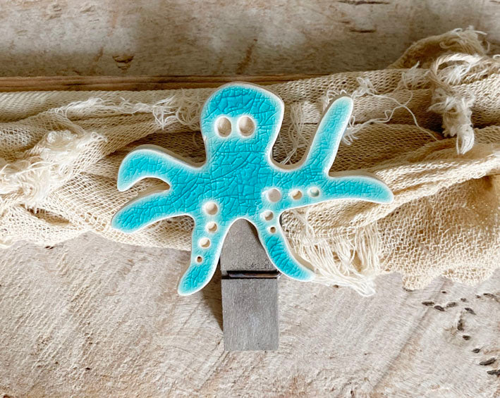 molletta larga in legno + calamita con polipo in ceramica turchese.