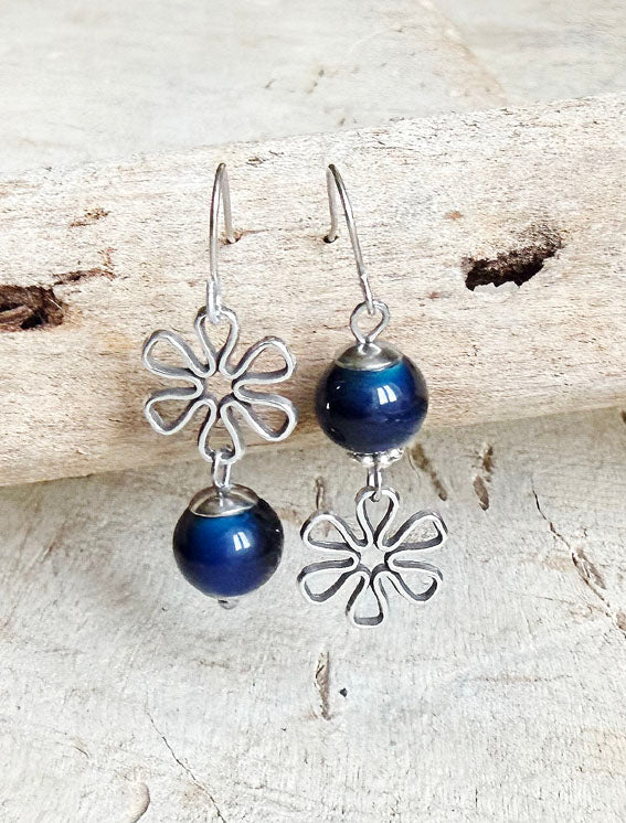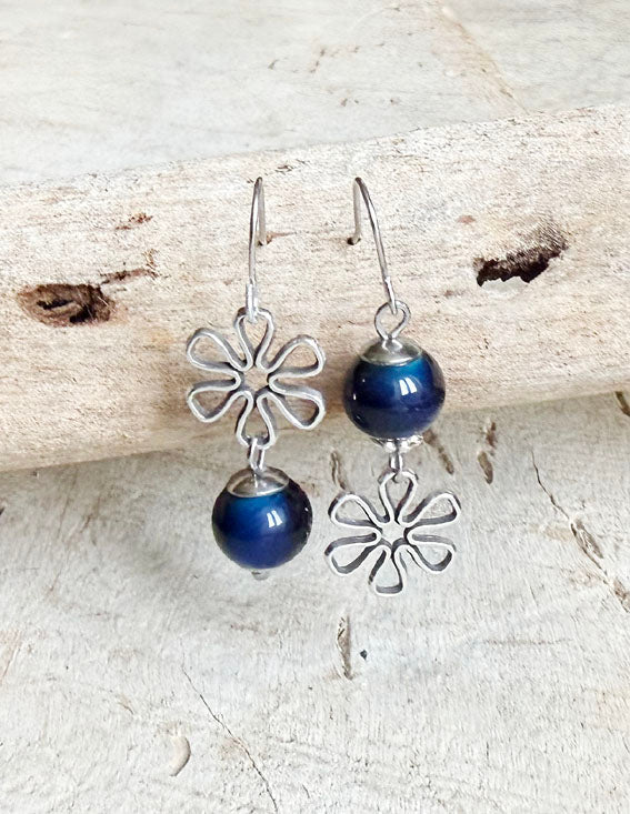 orecchini con perle in vetro di murano lavorate a lume color blu scuro + fiori.