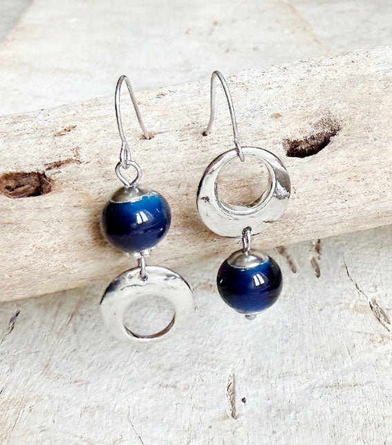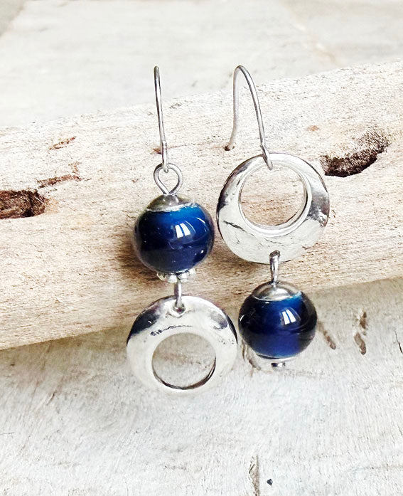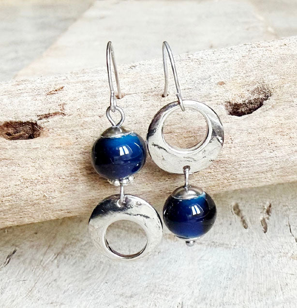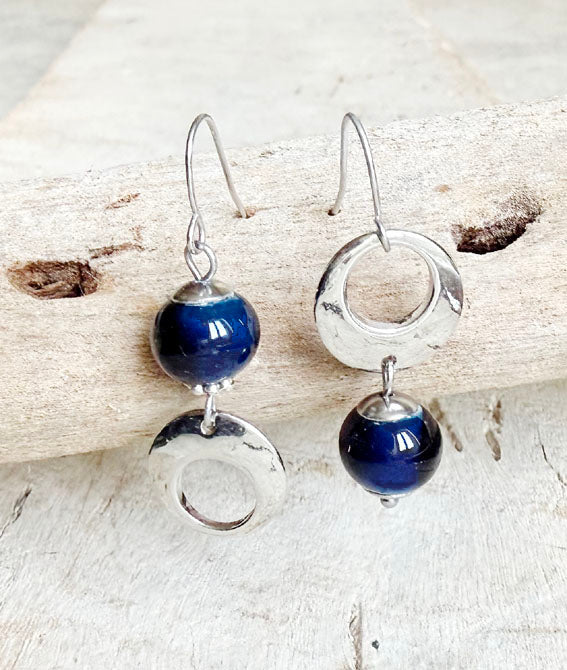 orecchini con perle in vetro di murano lavorate a lume color blu scuro + cerchi.